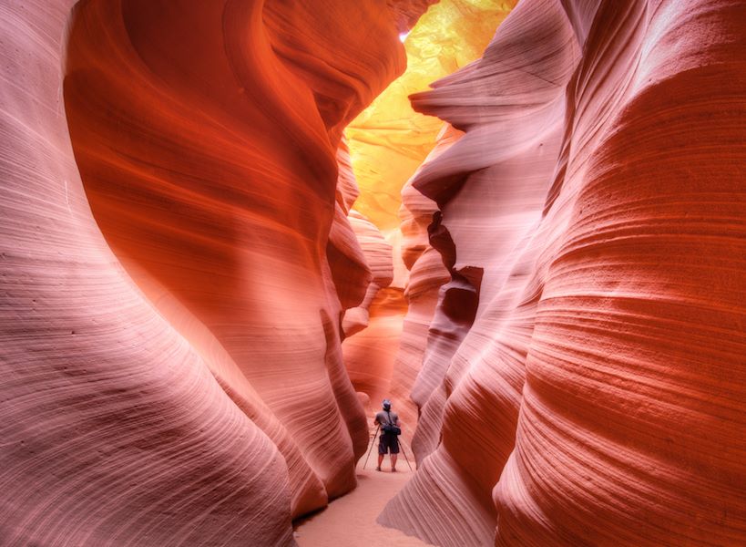 Voliamo in Arizona, sulla terra dei Navajos, per visitare l’Antelope Canyon, autentico spettacolo di madre natura. È un canyon stretto con forme interne vertiginose create dall’acqua e dal vento. La luce entra solo dalla parte superiore e in certi momenti del giorno regala all’arenaria una tonalità cromatica mozzafiato. Di Antelope Canyon ne esistono due: l’Upper Antelope Canyon e il Lower Antelope Canyon. Il primo, chiamato dai Navajo “il luogo dove l’acqua scorre attraverso le rocce”, è la parte più famosa e visitata: è facilmente accessibile e presenta con più frequenza il fenomeno della penetrazione dei raggi di luce. Il secondo, il Lower Antelope Canyon, non dispone di un facile accesso. Si entra con delle scalette di ferro e il percorso è molto complicato.