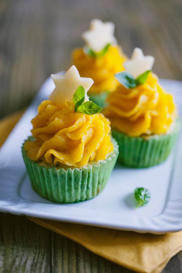 Spuntate le zucchine, grattugiatele e mettetele in un colino lasciandole scolare per 20minuti, in modo che perdano l’acqua di vegetazione. A parte tagliate il pollo a pezzetti e mettetelo in un frullatore, fino a ottenere un composto omogeneo. Trasferitelo in una ciotola, aggiungete la mollica di pane, il Parmigiano, il timo, il basilico tritato, le zucchine scolate e l’uovo. Mescolate gli ingredienti e trasferite il composto in una sac a poche. Riempite a questo punto gli stampini dei cupcake e metteteli nel forno a cuocere per 20 minuti a 180°. Quando saranno cotti lasciateli raffreddare e poi guarniteli con un ciuffo di crema alla zucca. Decorate poi ogni cupcake con una stellina di Emmental e una fogliolina di basilico. I bambini non sapranno resistere!