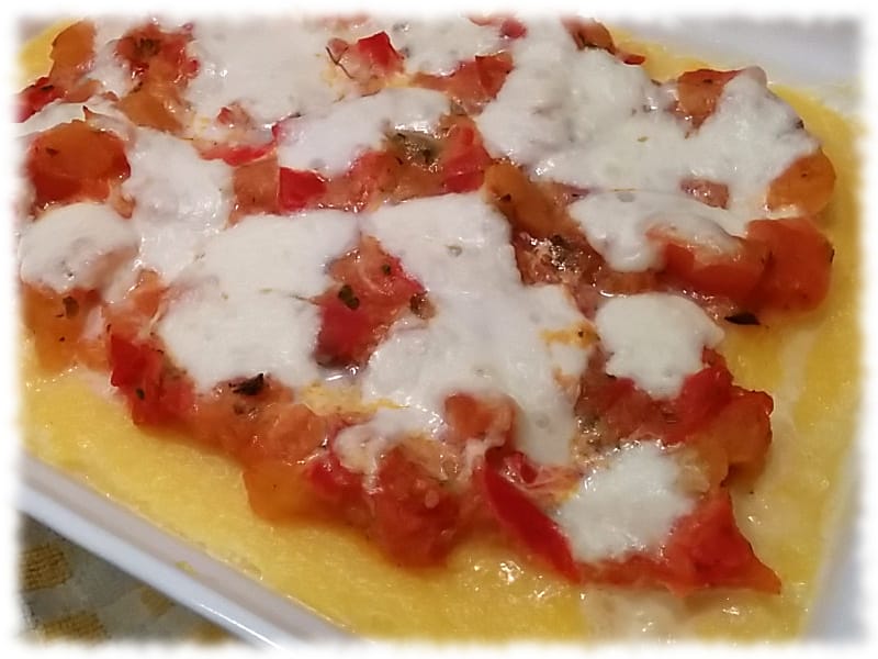 – Riprendete la pirofila con la polenta e distribuite sulla superficie il pomodoro, la mozzarella in pezzi e l’origano.