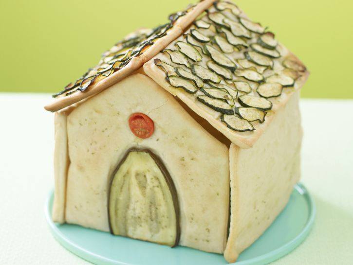 4) Stendete la pasta, sul piano infarinato, a 3-4 mm di spessore. Posatevi le sagome e ritagliate i pezzi della casetta, allineandoli su 2 placche rivestite di carta da forno. Disponete le zucchine sulle falde del tetto, la melanzana e 1/2 pomodorino sulla facciata. Fate riposare le focacce alle verdure per 1/2 ora quindi infornatele a 200° C per circa 15 minuti.