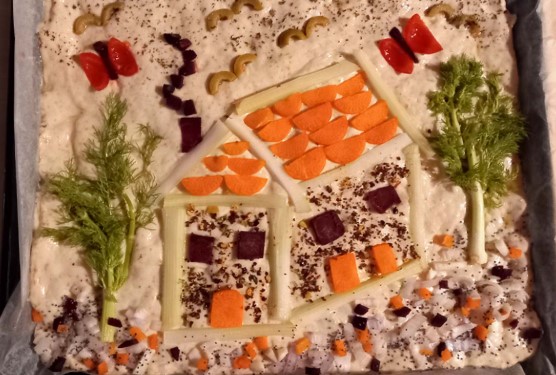 3) Sfornate le focacce e fatele raffreddare, poi assemblate la casetta di focaccia alle verdure incollando i pezzi tra loro con della maionese.Servite in tavola. . . !!!