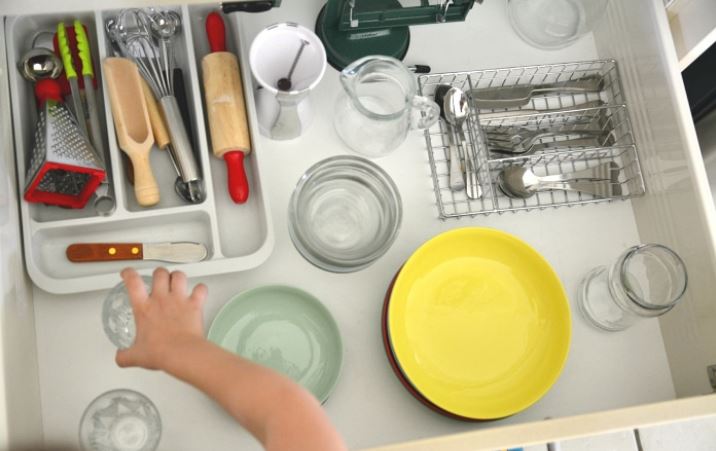 Possiamo anche predisporre un cassettino basso in cui il bambino possa trovare i suoi piatti, stoviglie e bicchieri per apparecchiarsi la tavola o per contribuire nel preparare la cena con i genitori.