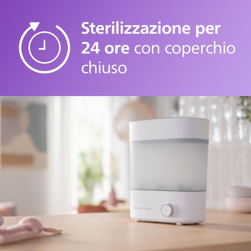 La potenza del motore integrato è abbastanza alta, 650 W, e consente di ridurre al minimo i tempi di sterilizzazione: si parla infatti di una durata di circa 6 minuti, un valore davvero basso che solitamente si trova soltanto negli sterilizzatori da forno a microonde. La possibilità di scegliere di volta in volta il contenitore da utilizzare, modulando la capienza in base alle proprie necessità, è sicuramente un valore aggiunto: si tratta infatti di una caratteristica strutturale che rende questo prodotto adatto a igienizzare sia pochi ciucci per volta che tutti gli oggetti che possono entrare in contatto con la bocca del bambino.