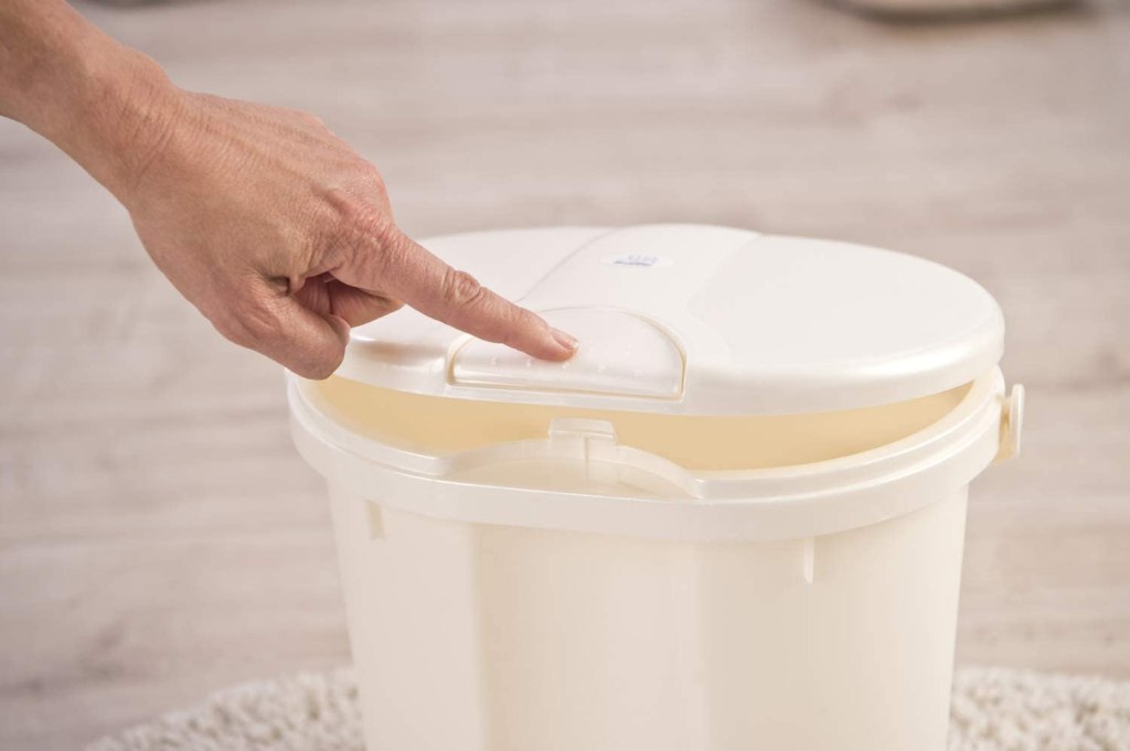 Un mangiapannolini robusto con manico per il trasporto, design con linee eleganti e dettagli sulla superficie, Capacità 11 L, Adatto a tutti i sacchetti per rifiuti. Facile da usare: innovativa chiusura a pulsante per l’apertura e chiusura con una sola mano, soluzione salva-spazio accanto al fasciatoio o in bagno, anti-odore grazie alla chiusura ermetica. Il materiale è resistente in polipropilene riciclabile, chimicamente inerte, facile da lavare con acqua calda e sapone. Dimensioni: 32 x 28 x 35 cm.
