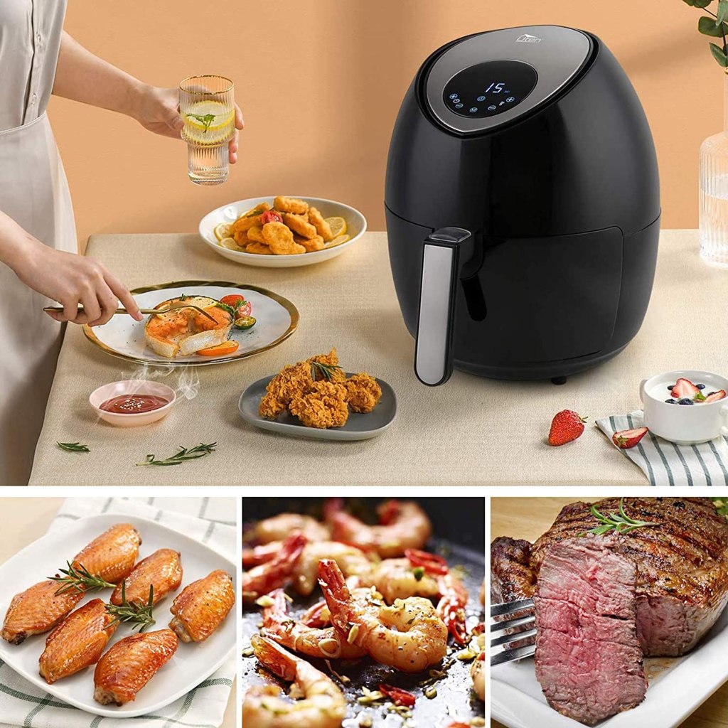Questa friggitrice ad aria sviluppata da Innsky ha una capacità da 5,5 litri che la rende ideale per cucinare grandi quantità di alimenti, come ad esempio un pollo arrosto. Sfruttando il calore dell’aria, che viene fatta circolare a una temperatura molto alta, la friggitrice sopperisce all’uso dell’olio cuocendo gli alimenti in modo molto più sano ed evitando sia il cattivo odore tipico del fritto che i classici schizzi. Il dispositivo firmato Innsky è inoltre multi-cooker, nel senso che permette di preparare un’ampia gamma di piatti, che spaziano dalla carne al pesce, passando per le verdure, le torte salate e le crêpes, comportandosi come un piccolo forno elettrico ventilato. Caratterizzata da un elegante stile scuro, la friggitrice ad aria è impreziosita da un display LCD digitale sulla parte frontale che dà la possibilità all’aspirante chef di beneficiare degli 8 programmi preimpostati. La temperatura, regolabile attraverso lo schermo touch, raggiunge i 200°C, il timer integrato può essere impostato con una durata massima di 60 minuti, mentre gli appositi segnali acustici indicano sia il “pronto cottura” e il termine della cottura. Le parti removibili della friggitrice possono essere lavate in lavastoviglie e asciugate con aria calda dopo la pulizia.