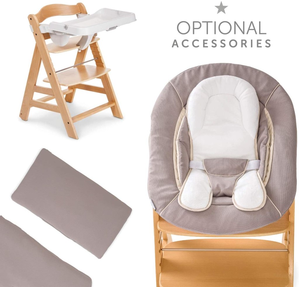 Il vassoio estraibile è ampio e la seduta è imbottita con un tessuto impermeabile. Lo schienale è reclinabile fino alla posizione nanna, rendendolo adatto fin dalla nascita. È possibile regolare l’altezza di questo modello per trasformarlo in una sedia rialzata senza vassoio e braccioli oltre che utilizzare una parte come rialzo sedia.