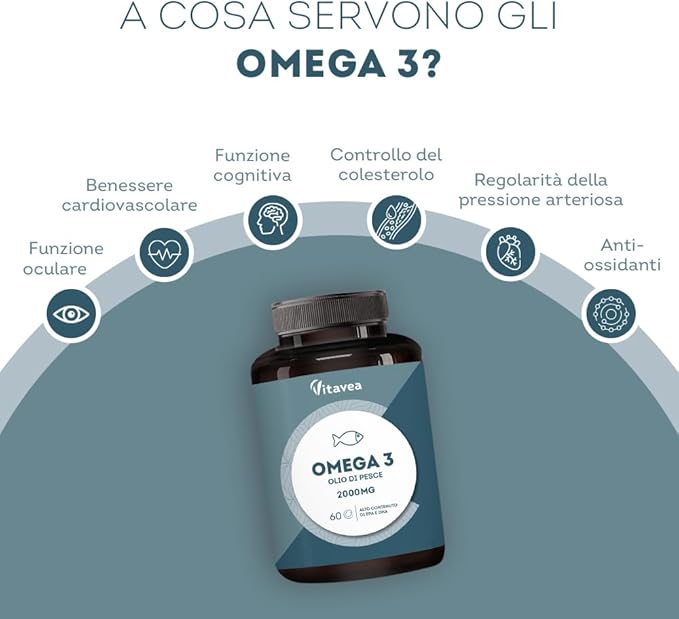 - Omega-3: – Olio di pesce purificato e concentrato, ricco di EPA e DHA.