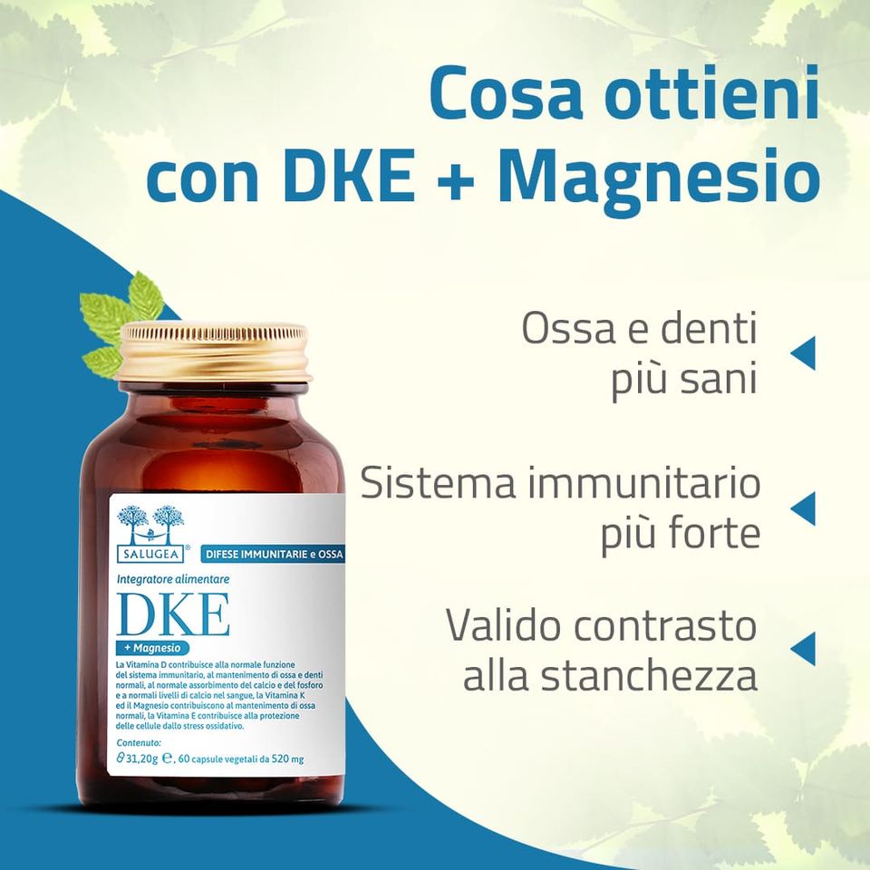 DKE + Magnesio è utile per mantenere funzionali ossa e denti, per sostenere le difese immunitarie e per constare la stanchezza nei momenti di stress o cambio di stagione.